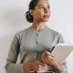 Real estate agents in hard hats reviewing plans beside a house for sale.